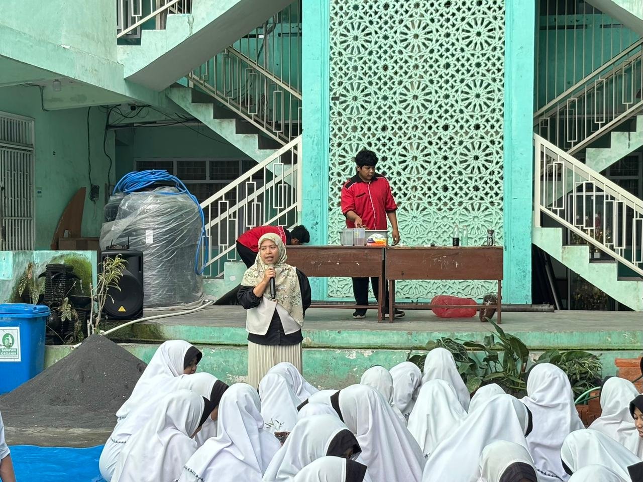 Sementara itu, Lapangan Olahraga Madrasah disulap menjadi area Kimia Analisis bagi siswa kelas 9E, 9F, dan 9G. Di sini, mereka melakukan pengujian kualitas air sederhana. Mulai dari menguji tingkat kekeruhan, perubahan warna, hingga mendeteksi bau air. Praktikum ini bertujuan menumbuhkan kesadaran siswa akan pentingnya menjaga kebersihan sumber air di lingkungan sekitar.