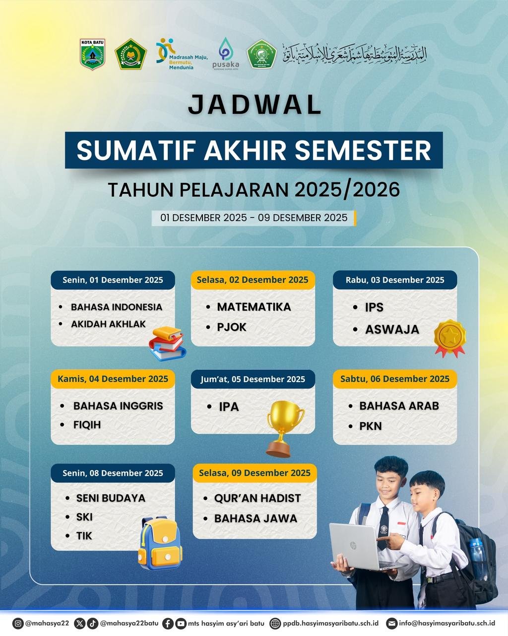 Kota Batu, 2 Desember 2025 – MTs Hasyim Asy'ari Kota Batu tengah melaksanakan Asesmen Sumatif Akhir Semester (ASAS) berbasis komputer yang dimulai sejak 1 Desember dan akan berlangsung hingga 9 Desember 2025. Seluruh siswa kelas 7, 8, dan 9 ikut serta dalam kegiatan ini sebagai bagian dari evaluasi pembelajaran selama satu semester.